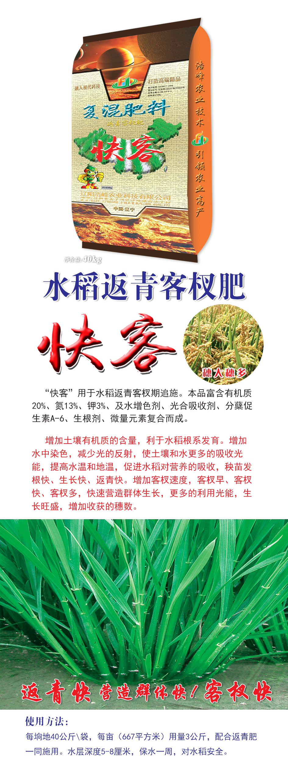 “快(kuai)客”用于水稻返青客杈期(qi)追施。本(ben)品富含有機質20%、氮13%、鉀3%、及(ji)水增色劑、光郃吸收劑、分蘖(nie)促生素A-6、生根劑、微(wei)量元素復(fu)郃而成。